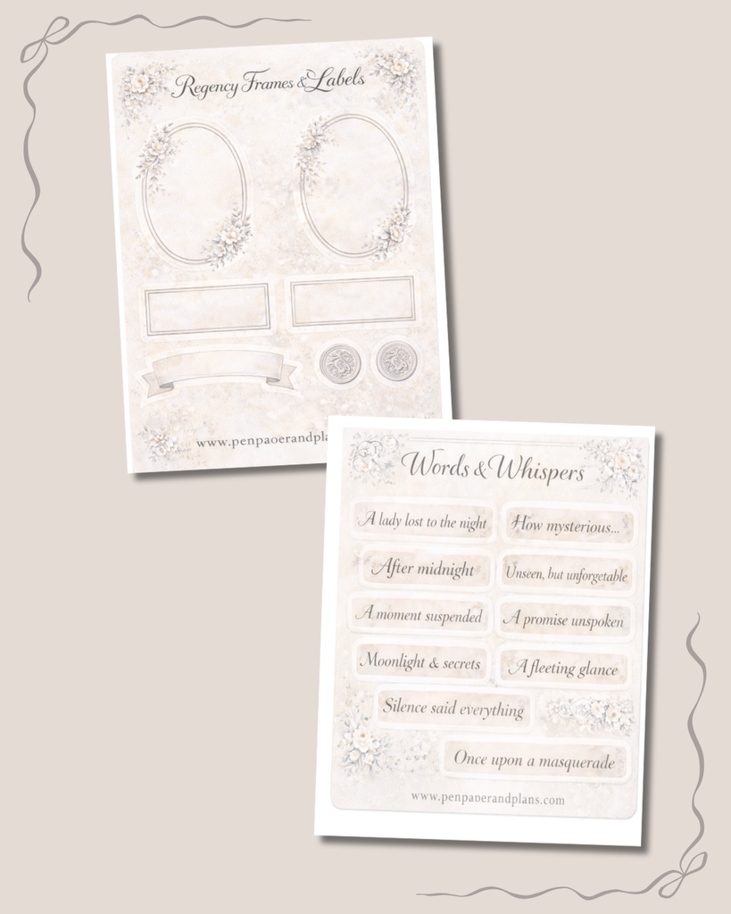 This Regency-inspired collection includes five coordinating sticker sheets filled with soft florals, elegant labels, romantic phrases, and dreamy decorative accents.